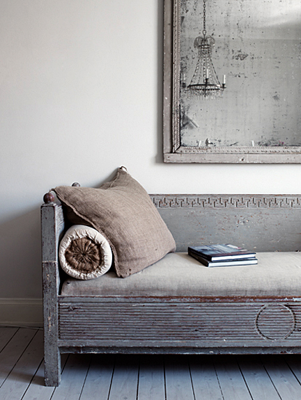 I, for one, am enjoying the variety of mirrors that have been featured lately in design mags. Distressed, new, old- they are a charming way to bring more light and life into the room.